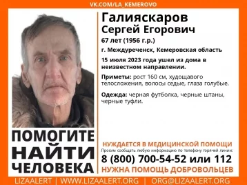 Волонтёры начали поиски пропавшего 67-летнего Сергея Галияскарова. Он ушёл из дома в субботу, 15 июля, и не вернулся. Отмечается, что мужчина нуждается в медицинской помощи.