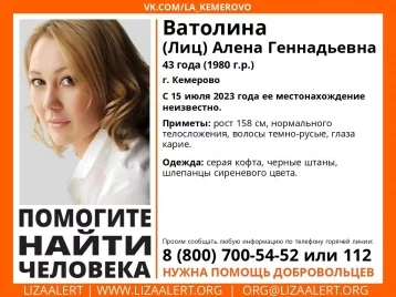 43-летняя Алёна Ватолина пропала в субботу, 15 июля. С этого дня о её местонахождении ничего неизвестно.