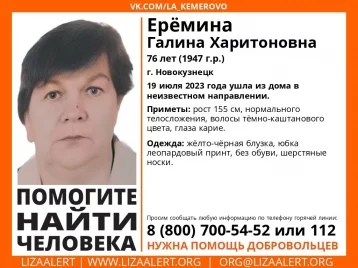 Волонтёры поисково-спасательного отряда «Лиза Алерт» в Кемеровской области объявили о старте поисков новокузнечанки 1947 года рождения. Ерёмина Галина Харитоновна ушла из дома в неизвестном направлении 19 июля.