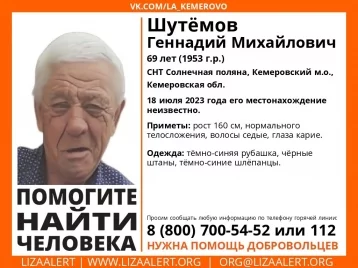В СНТ «Солнечная поляна» в Кемеровском округе пропал 69-летний Геннадий Шутёмов. Его местонахождение неизвестно с 18 июля.