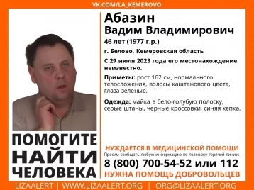 Пропал 46-летний Вадим Абазин. О его местонахождении ничего неизвестно с 29 июля. Отмечается, что мужчина нуждается в медицинской помощи.