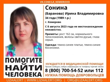Волонтёры поисково-спасательного отряда «Лиза Алерт» сообщили о бесследном исчезновении кемеровчанки 1989 года рождения. Местонахождение Сониной (Барановой) Ирины Владимировны остаётся неизвестным с 8 августа.