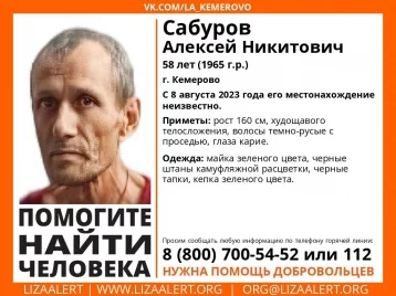 В Кемерове пропал без вести Сабуров Алексей Никитович. Поисками мужчины 1965 года рождения занялись волонтёры поисково-спасательного отряда «Лиза Алерт» в Кузбассе.