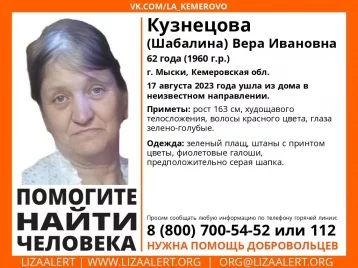 Волонтёры поисково-спасательного отряда «Лиза Алерт» в Кемеровской области сообщили о бесследном исчезновении жительницы Мысков 1960 года рождения. 17 августа Кузнецова (Шабалина) Вера Ивановна ушла из дома в неизвестном направлении.