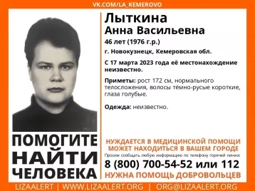 Местонахождение Лыткиной Анны Васильевны остаётся неизвестным с 17 марта 2023 года. Рост пропавшей — 172 сантиметра, телосложение нормальное. Волосы тёмно русые короткие, глаза голубые. Информации об одежде нет. Уточняется, что женщина может находиться в любом городе региона.