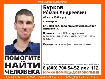 В Кемерове ищут без вести пропавшего Романа Андреевича Буркова 1982 года рождения. 40-летний кемеровчанин пропал 19 мая, с тех пор о нём ничего не известно, сообщают волонтёры поисково-спасательного отряда «Лиза Алерт».
