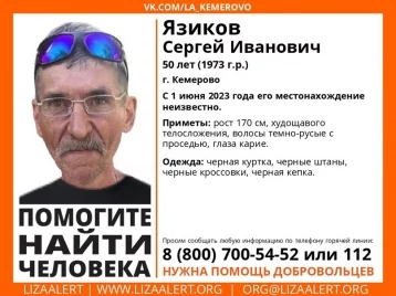 Приметы пропавшего: рост 170 см, худощавый, тёмно-русые с проседью волосы, карие глаза. Он был одет в чёрную куртку, чёрные штаны, чёрные кроссовки и чёрную кепку.