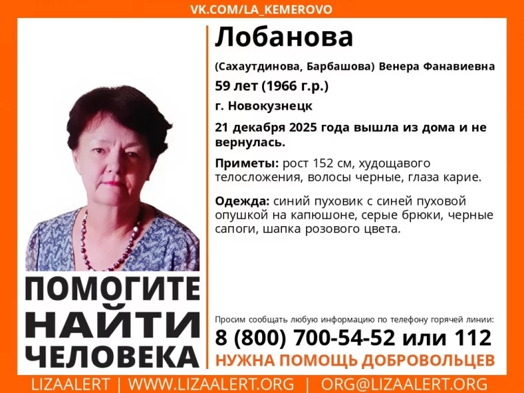 «Пропала Лобанова (Сахаутдинова, Барбашова) Венера Фанавиевна, 59 лет, г. Новокузнецк», — сообщили волонтёры поисково-спасательного отряда «Лиза Алерт» Кузбасс.
