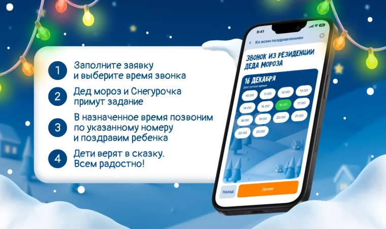 С 22 по 31 декабря у вас есть уникальная возможность заказать бесплатный звонок от самого Дедушки Мороза или его очаровательной внучки Снегурочки! Главные герои праздника позвонят ребёнку, поздравят с Наступающим и похвалят за хорошее поведение.