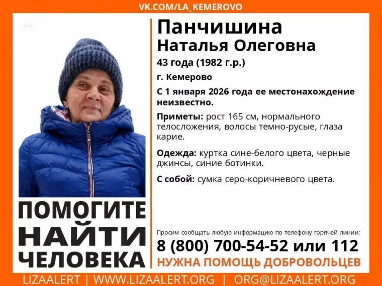 В Кемерове без вести пропала 43-летняя Наталья Панчишина. О её местонахождении ничего не известно с 1 января, сообщают волонтёры поисково-спасательного отряда «Лиза Алерт».