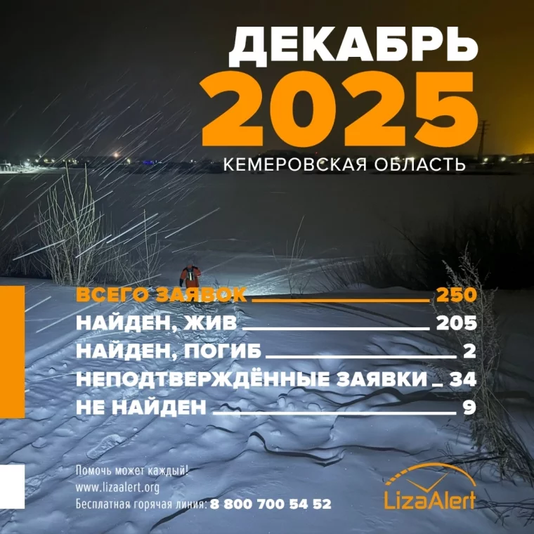 Всего в декабре отряд получил 250 заявок на поиск пропавших людей. 205 человек были найдены живыми, двое — погибшими, поиск ещё 9 человек продолжается. Неподтверждёнными оказались 34 заявки.