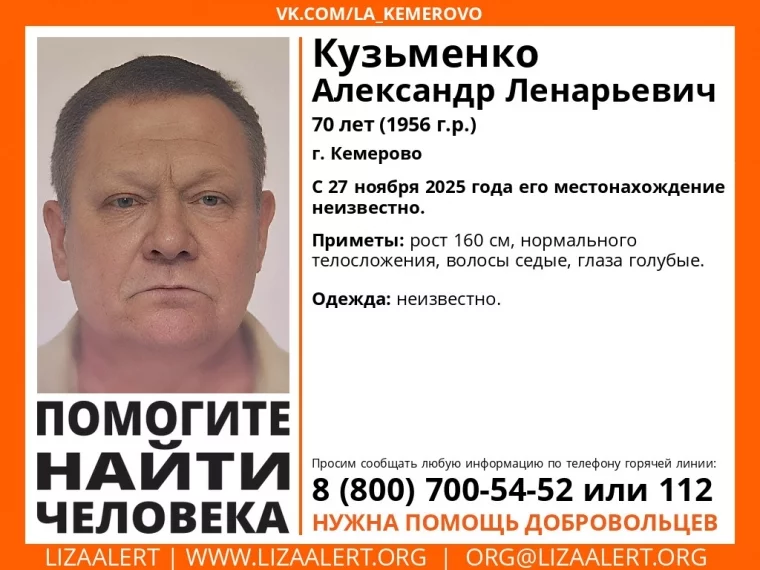 В Кемерове разыскивают Александра Кузьменко 1956 года рождения. Его местонахождение неизвестно с 27 ноября 2025 года.