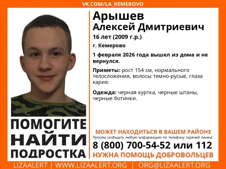 В Кемерове разыскивают Алексея Арышева 2009 года рождения. Он вышел из дома 1 февраля, с тех пор о нём ничего не известно.