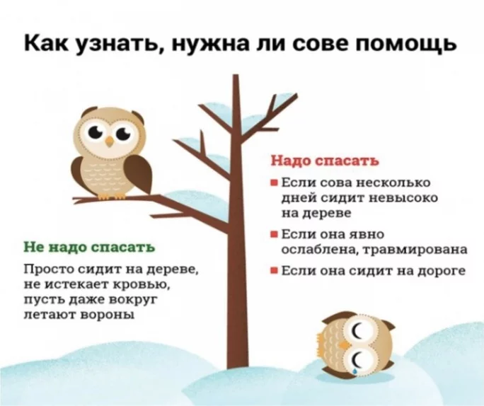 Спасать сову надо только если она ослаблена, получила травму или сидит на земле. В таком случае необходимо положить птицу в коробку и отвезти ветеринарам или в специальный центр реабилитации.