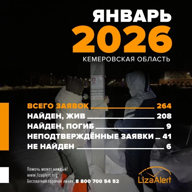 В январе 2026 года в поисково-спасательный отряд «Лиза Алерт» Кузбасс поступило 264 заявки на поиск пропавших людей. Большинство найдены живыми.