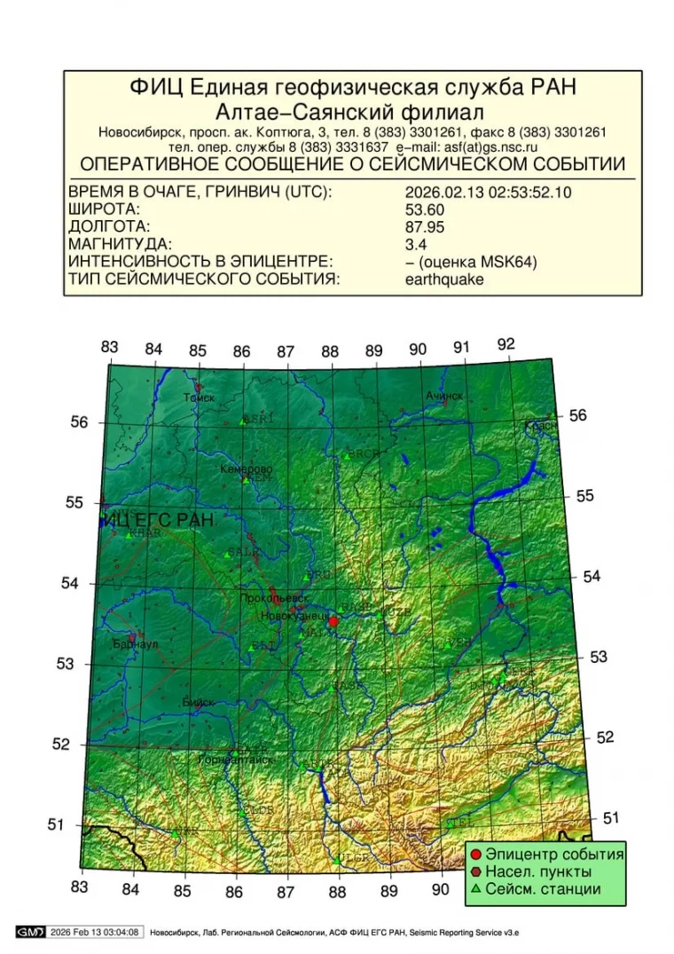Данные появились в оперативной сводке. Согласно им, в пятницу, 13 февраля, в 09:53 по местному времени зафиксированы подземные толчки в Междуреченске, в точке с координатами 53.60 широты и 87.95 долготы.