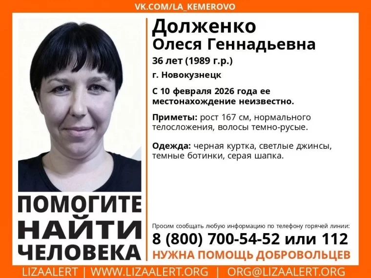 В Новокузнецке разыскивают Олесю Долженко 1989 года рождения. Она пропала в несколько дней назад, её местонахождение неизвестно с 10 февраля 2026 года.