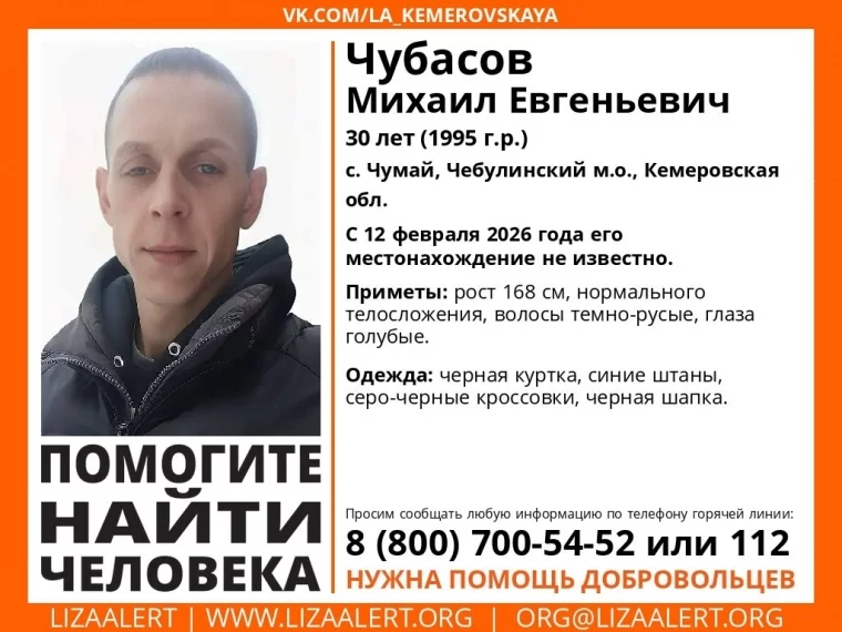 В селе Чумай Чебулинского округа без вести пропал 30-летний мужчина. С 12 февраля местонахождение Михаила Чубасова неизвестно, сообщили волонтёры поисково-спасательного отряда «Лиза Алерт».