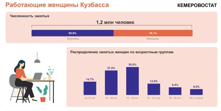 Типичной работающей жительнице Кузбасса — от 40 до 49 лет (30,8% от всех работающих женщин), у неё высшее (34%) или средне-профессиональное (30,6%) образование, она трудится в сфере торговли и общепита (23,5%) или образования (15,8%). Более 40% работающих женщин имеют детей до 18 лет, совмещая таким образом работу и воспитание детей.