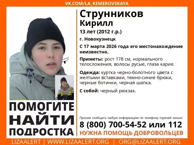 В Новокузнецке объявлены поиски 13-летнего подростка. Об этом сообщили волонтёры поисково-спасательного отряда ««Лиза Алерт» Кузбасс.