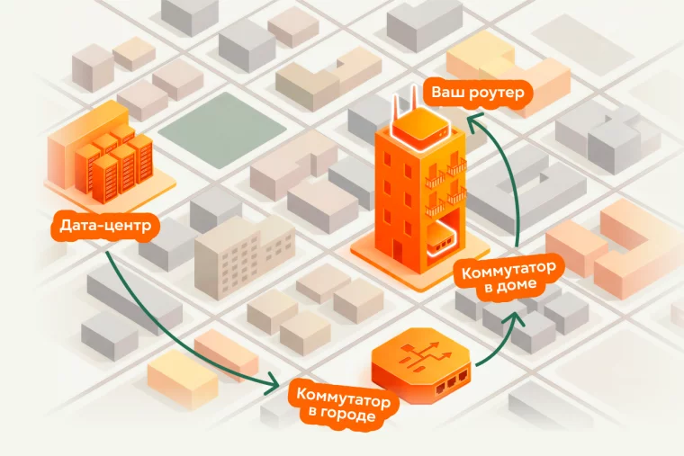 Гигабиты до вашего роутера проходят длинный путь: от дата-центра они движутся сначала через внешние узлы по городу, затем попадают в узел, расположенный в многоквартирном доме, и только потом держат курс на роутер в вашей квартире.