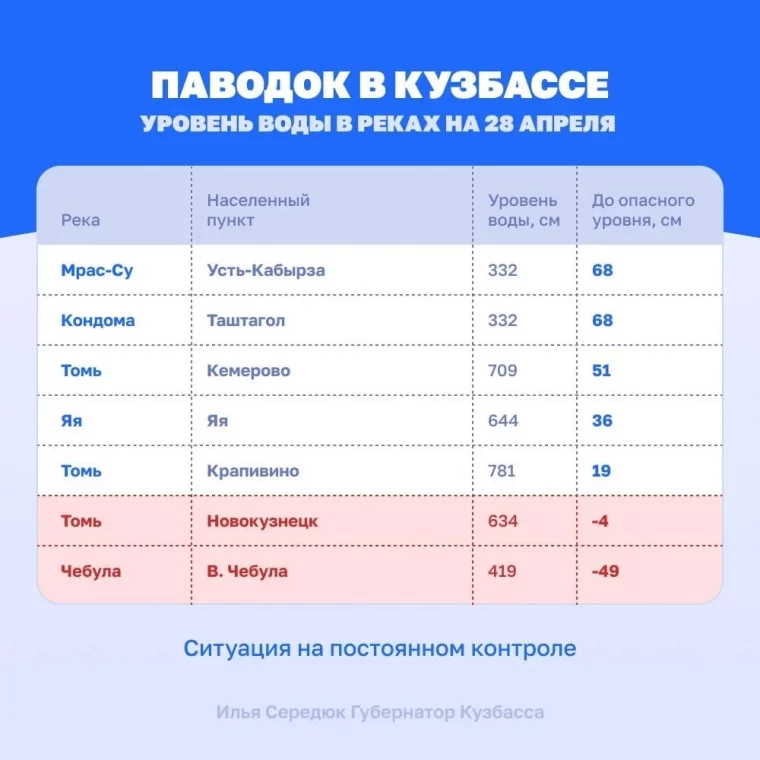 В двух территориях Кузбасса вода в реках преодолела опасную отметку. График уровня воды на текущий момент опубликовал губернатор Илья Середюк.