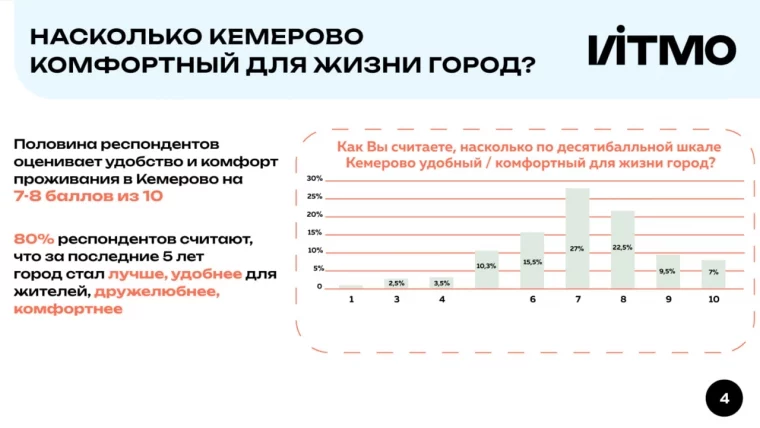 Согласно исследованию, у горожан в целом сформирован позитивный образ Кемерова. Почти половина опрошенных оценивает комфорт проживания на 7-8 баллов из 10, а 80% считают, что за последние годы город стал удобнее и комфортнее. При этом только около 15% респондентов рассматривают возможность переезда.