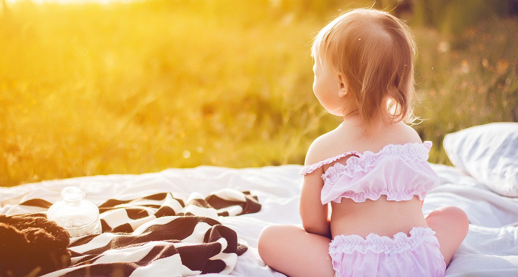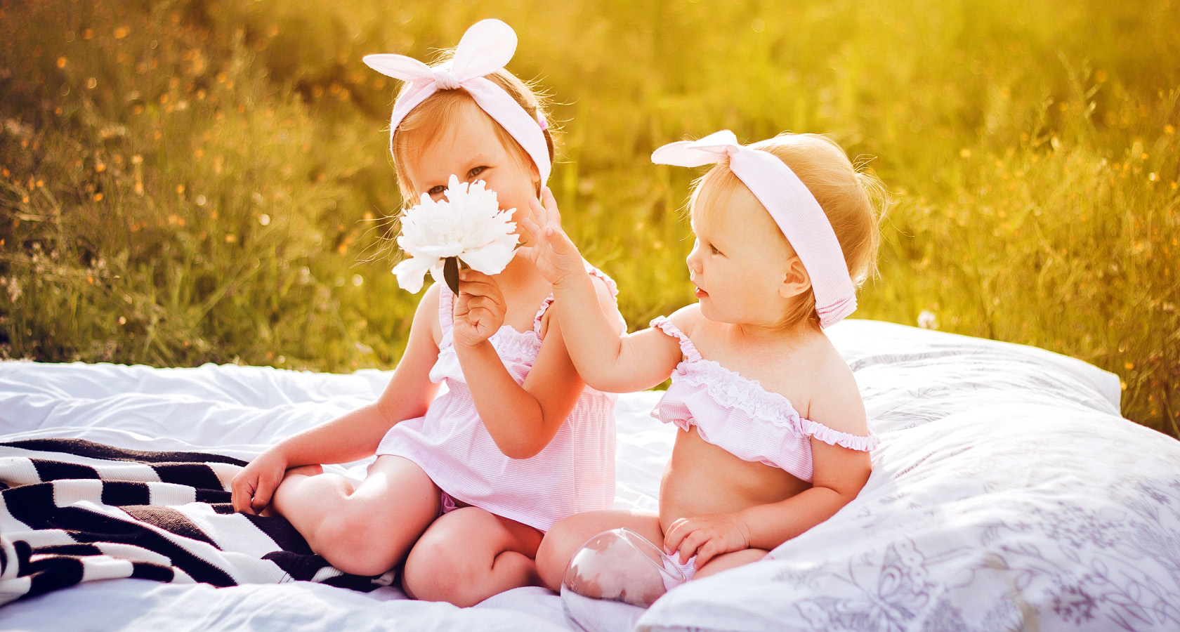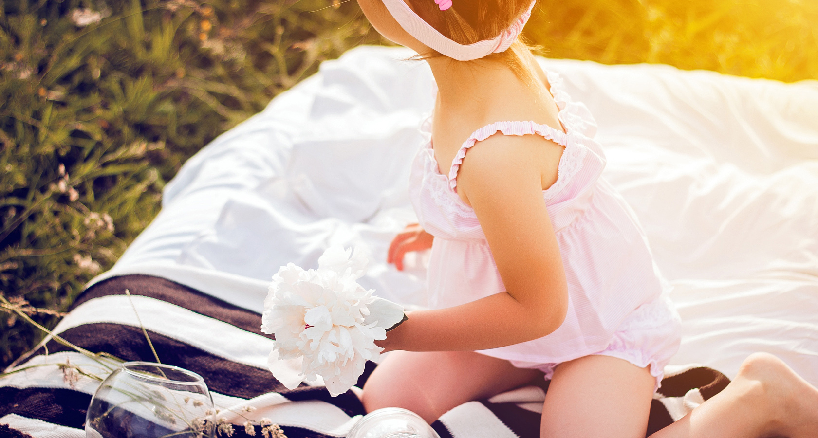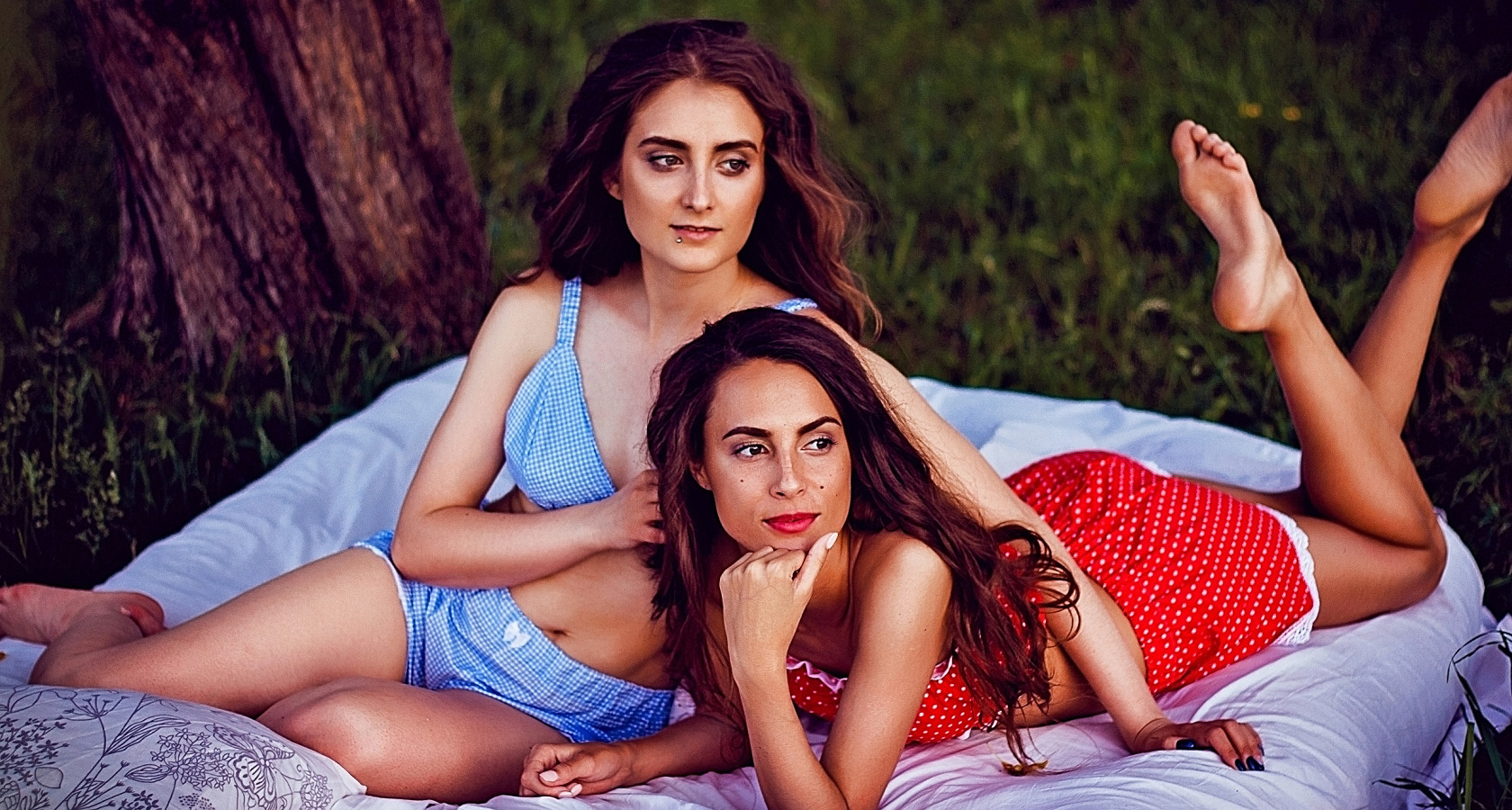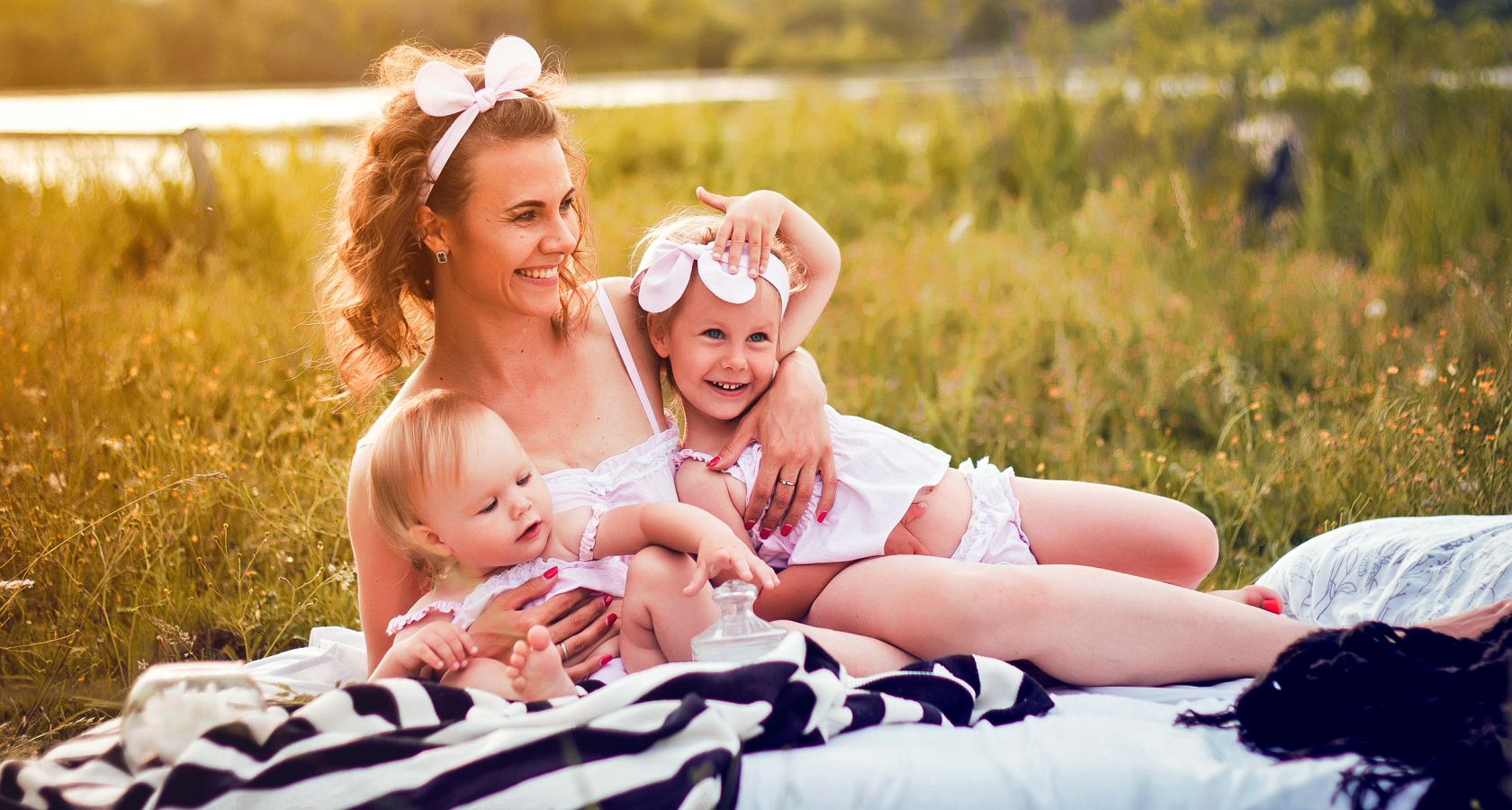 На свежем воздухе отдыхают мама и её дочки. Дуновение ветра развевает волосы и гладит лёгкое кружево. Хлопок приятно касается кожи. Девочки наблюдают за бабочками и слушают пение птиц. Разыгравшись, они щекочут друг друга ароматными травинками. Мама улыбается и ласково обнимает детей. После насыщенного дня сладко спится на мягком покрывале.